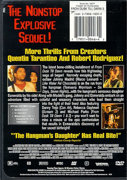 The latest bone-chilling installment of From Dusk Till Dawn reveals how this frightening saga all began! Narrowly escaping death, outlaw Johnny Madrid (Marco Leonardi - Like Water For Chocolate) is on the run from the hangman (Temuera Morrison - Six Days, Seven Nights)...with the hangman's sensuous daughter Esmeralda by his side! Along with Madrid's gang, Johnny and Esmeralda embark on an adventure filled with colorful and unsavory characters who lead them straight into the fight of their lives! Also featuring Danny Trejo (Con Air), Rebecca Gayheart (Scream 2), and Michael Parks (From Dusk Till Dawn 1 & 2) - you won't want to miss a minute of the epic confrontation that results in Esmeralda's discovery of her secret birthright!