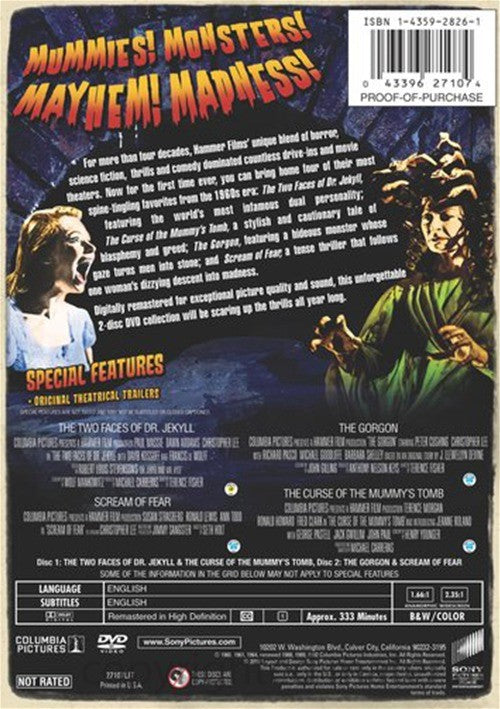 For more than four decades, Hammer Films' unique blend of horror, science fiction, thrills and comedy dominated countless drive-ins and movie theaters. Now for the first time ever, you can bring home four of their most spine-tingling favorites from the 1960s era: The Two Faces of Dr. Jekyll, featuring the world's most infamous dual personality; The Curse of the Mummy's Tomb, a stylish and cautionary tale of blasphemy and greed; The Gorgon, featuring a hideous monster whose gaze turns men into stone; and Scream of Fear, a tense thriller that follows one woman's dizzying descent into madness.